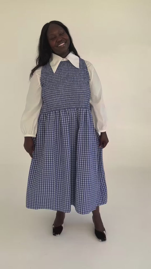 A smocked bodice midi dress with a flexible, light weight, and most importantly comfortable fit. The stretchy smocking is perfect for accommodating larger busts without loosing shape and cute a keyhole back closure makes this dress easy to take on and off. Our Weekend Plaid fabric is soft, airy, woven, with just a little bit of texture.
